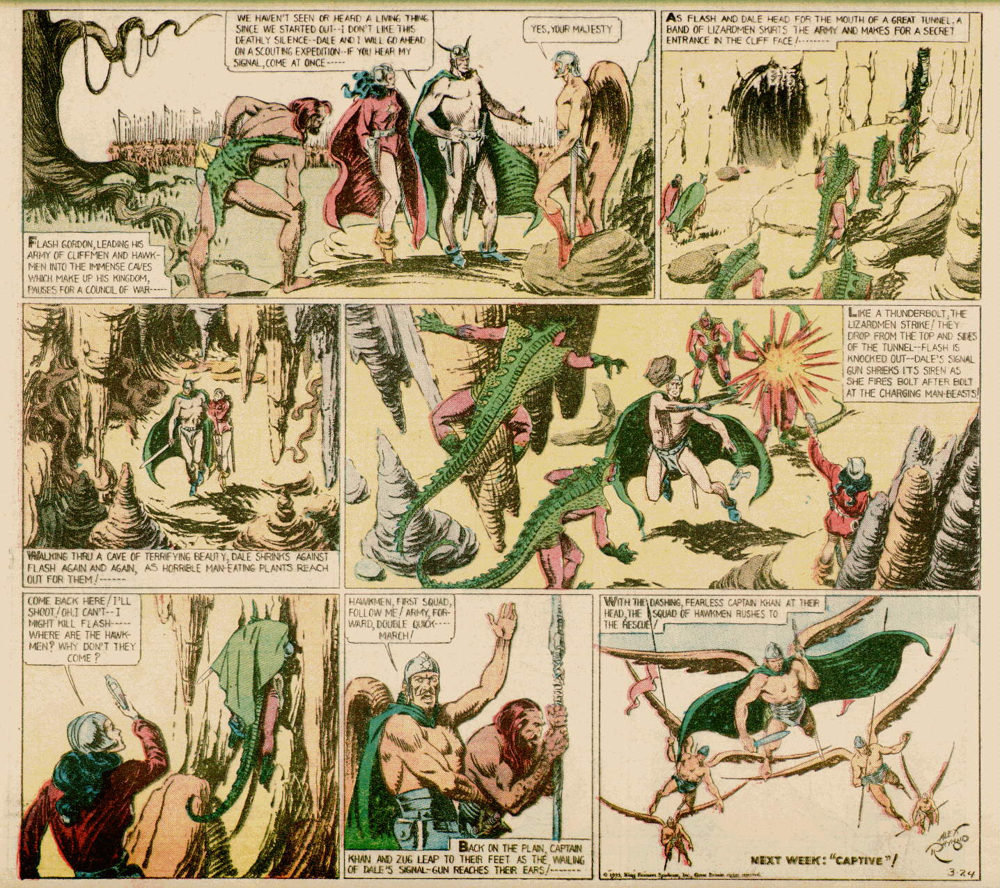 NOCIDAS DE SU GENERO. RAYMOND SE ENCARGO JUNTO A SU AYUDANTE AUSTIN BRIGGSI DE LA SERIE, HASTA MAYO DE 1944, CUANDO RAYMOND FUE LLAMADO A FORMAR PARTE DE LA MARINA, COMO CAPITAN DE RESERVA EN EL PORTAAVIONES GILBET ISLANDS. ES ALLI DONDE BNRIGGS TOMA EL CONTROL DE LA SERIE, SACANDOLA DE SU TIRA DIARIA Y TRASLADÁNDOLA A LOS DOMINGOS. EN 1946, REGRESA A LA VIDA CIVIL, PERO DECIDE SEGUIR CON OTROS PERSONAJES (AGENT X-9, RIP KIRBNY, JUNGLE JIM) Y DEJA A FLASH GORDON A CARGO DE EMANUEL “MAC” RABOY EN DIBUJO Y DON MORE EN GUIONES